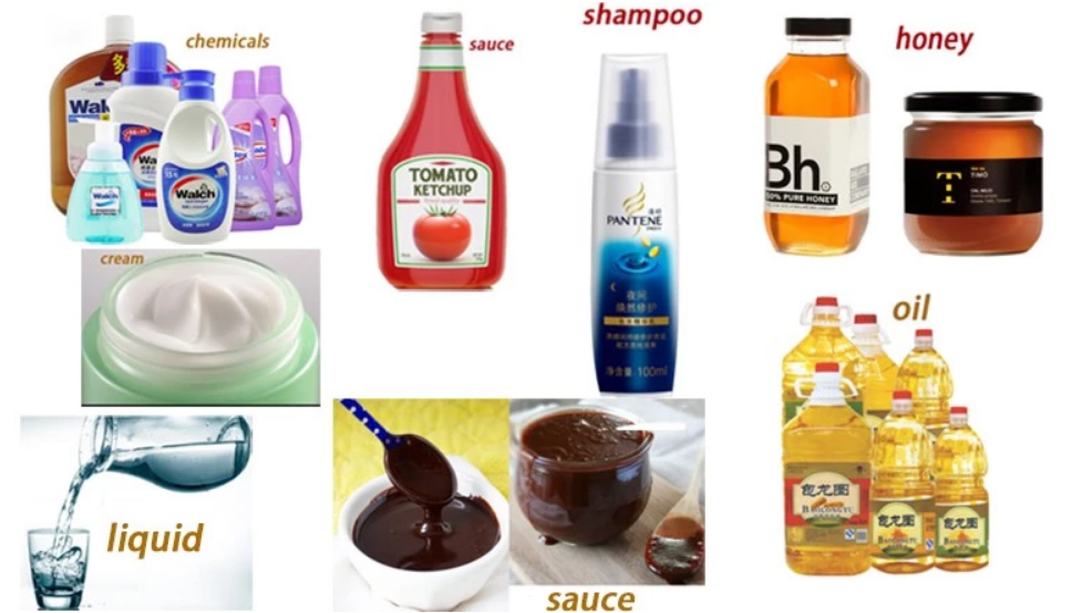 Yarı viskoz ve viskoz sıvılar; ketçap, hardal, şuruplar, salsa, mayonez, bal, fıstık ezmesi, jöleler, daldırma sosları, dudak kremi, şampuan, kalın sabunlar, şekillendirici jeller, yüz maskeleri, balmumu, tutkal, gres, dolgu macunları, silikon ve çok daha fazlası