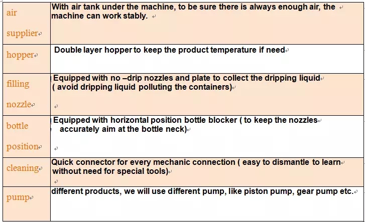 Bu makine, gıda yağı, kimya endüstrisi ve motor yağı, motor yağı, salata, el yıkama jeli, hindistancevizi yağı, soya sosu, susam, şampuan, sıvı sabun, motor yağı gibi her türlü viskozite / sıvı için özel olarak üretilmiştir. , fren yağı, yemeklik yağ, domates sosu, içecek, uçucu yağ, bitkisel yağ, bal, biber sosu, fıstık ezmesi, yoğurt, meyve suyu, içecek vb. Sıvı / sos ile temas edilen tüm parçalar yüksek kaliteli paslanmaz çeliktir. Dolum için pistonlu pompayı benimser.Konum pompasını ayarlayarak, tüm şişeleri tek bir dolum makinesinde, hızlı hız ve yüksek hassasiyetle doldurabilir.